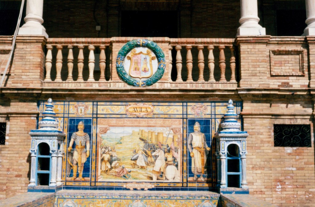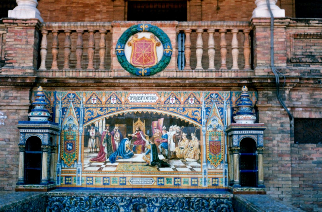 The next day is a Saturday and most of Spain appears headed along with us towards Seville. We stop for a meal in a village restaurant. As no one can understand what it is that we want to eat we are told to sit down and await a meal. This we do and are offered a fabulous salad, omelette, sausage and fruit for very few pesetas. By the end of the meal what had been an empty bar is crowded with travellers and locals all demanding lunch along with equally demanding children. A blistering afternoon turns into a lovely evening as we enter Seville and find ourselves a one-star hotel run by the unfortunate Carlos. We have our doubts about the place and its sources of income from the moment we arrive but it has an unbeatable price advantage. It is also right in the centre of town. We resolve to spend as little time in the room as possible. Carlos is detailed by mother to bring all our rubbish up as it is best not left on the bikes. We return from a late evening in the Bar des Artistes at 1am and Carlos is awakened to let us in. We leave at seven the next morning and Carlos is already washing the stairs and cleaning out the bathroom. It is a lovely day once again and reaches the mid-30s by early afternoon. We stroll around to the Palace building with its semi-circular design with murals depicting famous moments from the history of each of the provinces of Spain.