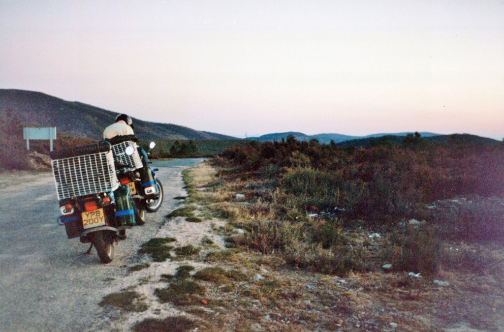 The next day we travel a long way south into Portugal. We come across our first non-asphalted section of road where we are amazed to able to maintain a heady 35 m.p.h. The smallest reassurances become important as our knowledge of what is to come is at best minute. As we cross a high pass, we experience our only snow of the whole trip and a wind so strong that we and the bikes are barely able to stand up. At the Portuguese border we chat to the guards in English for some time. Horses and carts are being driven home in the early evening sun along the bumpy roads. For the first time people are waving to us. We come across very few cars until we arrive in Braganza.