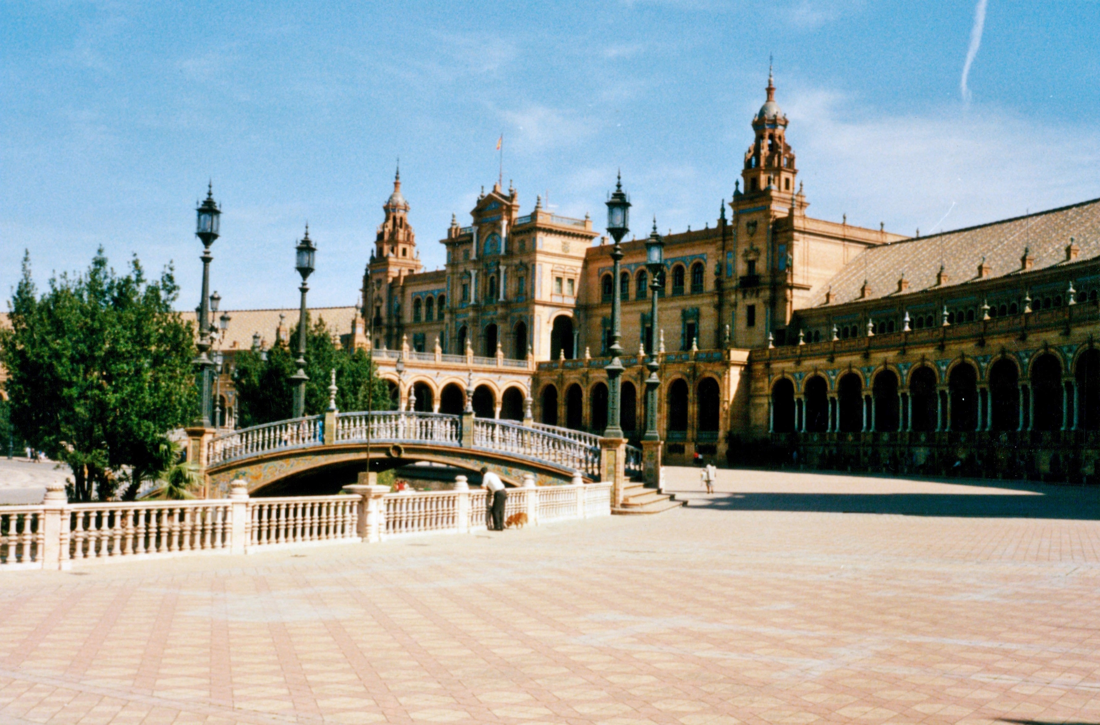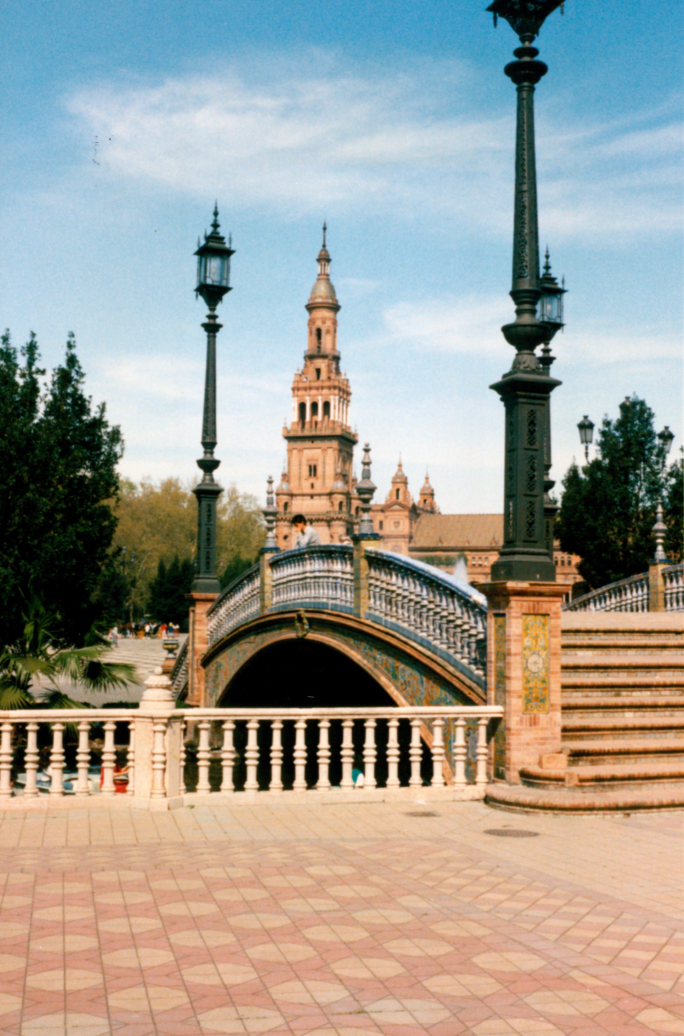 The next day is a Saturday and most of Spain appears headed along with us towards Seville. We stop for a meal in a village restaurant. As no one can understand what it is that we want to eat we are told to sit down and await a meal. This we do and are offered a fabulous salad, omelette, sausage and fruit for very few pesetas. By the end of the meal what had been an empty bar is crowded with travellers and locals all demanding lunch along with equally demanding children. A blistering afternoon turns into a lovely evening as we enter Seville and find ourselves a one-star hotel run by the unfortunate Carlos. We have our doubts about the place and its sources of income from the moment we arrive but it has an unbeatable price advantage. It is also right in the centre of town. We resolve to spend as little time in the room as possible. Carlos is detailed by mother to bring all our rubbish up as it is best not left on the bikes. We return from a late evening in the Bar des Artistes at 1am and Carlos is awakened to let us in. We leave at seven the next morning and Carlos is already washing the stairs and cleaning out the bathroom. It is a lovely day once again and reaches the mid-30s by early afternoon. We stroll around to the Palace building with its semi-circular design with murals depicting famous moments from the history of each of the provinces of Spain.