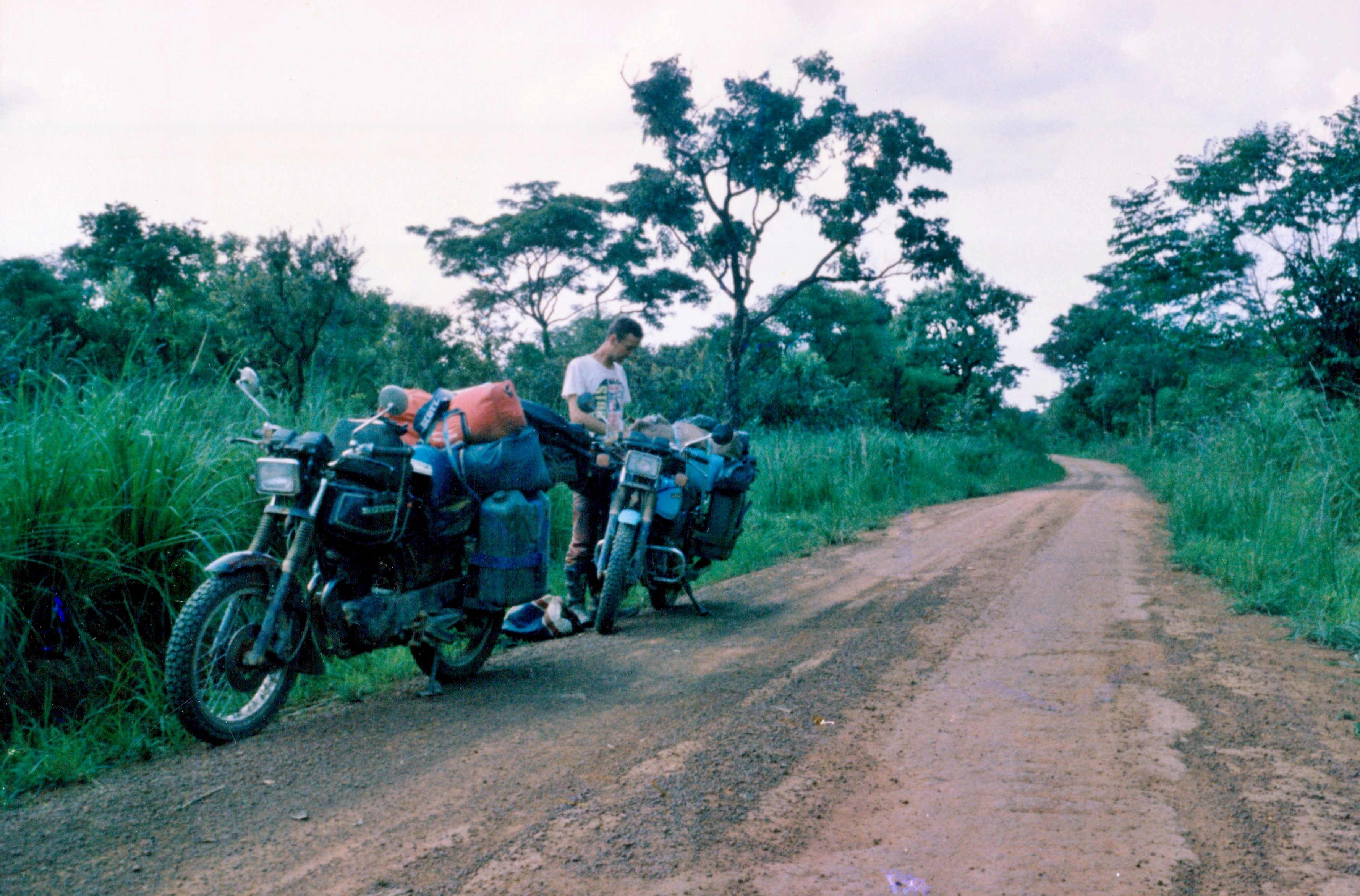 The bush is thick with many trees. We come across few villages on this stretch and everyone we see waves as we pass. The women wear long bright dresses made from a single piece of cloth. The men wear T-shirts and long cotton trousers or occasionally shorts. Nearly all of the men carry a type of machete called a panga. We stop before dark and set up our inner tents in the woods to keep off mosquitos. We cook our usual combination of vegetable stew adding a soup for flavour along with pasta. Although there has been much lightning early on it stops by mid-evening and we go to bed. About midnight, the downpour begins and 30 seconds later I am lying in a pool of water 2 inches deep. Even Leigh has woken up by this time but is less wet. I get up, put on dry clothes, all my waterproof riding gear and lie down by the tent until dawn arrives seemingly about 10 years later. That morning’s ride is very hard. It is still misty from the previous night’s rain and the woods are steaming as the sun heats up the sodden vegetation. The red mud from the track clings to our tyres, blocks our treads and fills the gap between the front tyre and the mudguard. We have to stop and clear it. It is only later that that we can go quickly enough for the tyres to stay clear. The surface of the track is so slippery that when we get to uphill sections we have to push each other’s bikes and it is impossible to make them travel in a straight line. Two hours before dark we are only 30 miles from Yaounde but discover that the ferry marked on the map is no longer working so we must make an additional detour of 30 miles to get to the main road to the capital. This stretch on the gravel road in the dark proves to be one of the most frightening of the whole trip. There are cars passing on either side of the road mostly without any lights at all and our vision is further obscured by the clouds of dust that they throw up. We finally manage to get to Yaounde in one piece and find a hotel, grab some food and collapse into our beds.