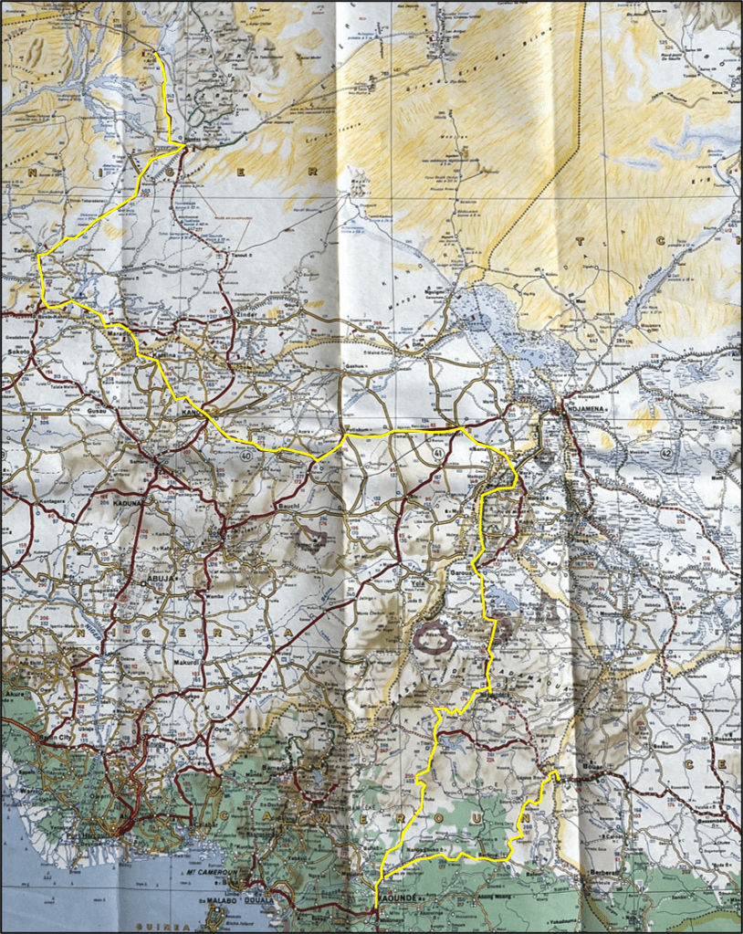All day we head south on mountain tracks before stopping 30 miles north of Garoua. That night as every night in Cameroun there are tremendous displays of lightning with discharges continuing for hours all around. We pass through Garoua the next day and take the asphalted road south. On our map is a sign that elephant can be seen 10 miles east of this road by a large lake. We head down the track that leads to the lake but we arrive at the village nearby we are told that is a centre for hunting elephant not seeing them; not at all what we want! An uneventful day’s ride takes us to N’gaoundere and the Railway Hotel.