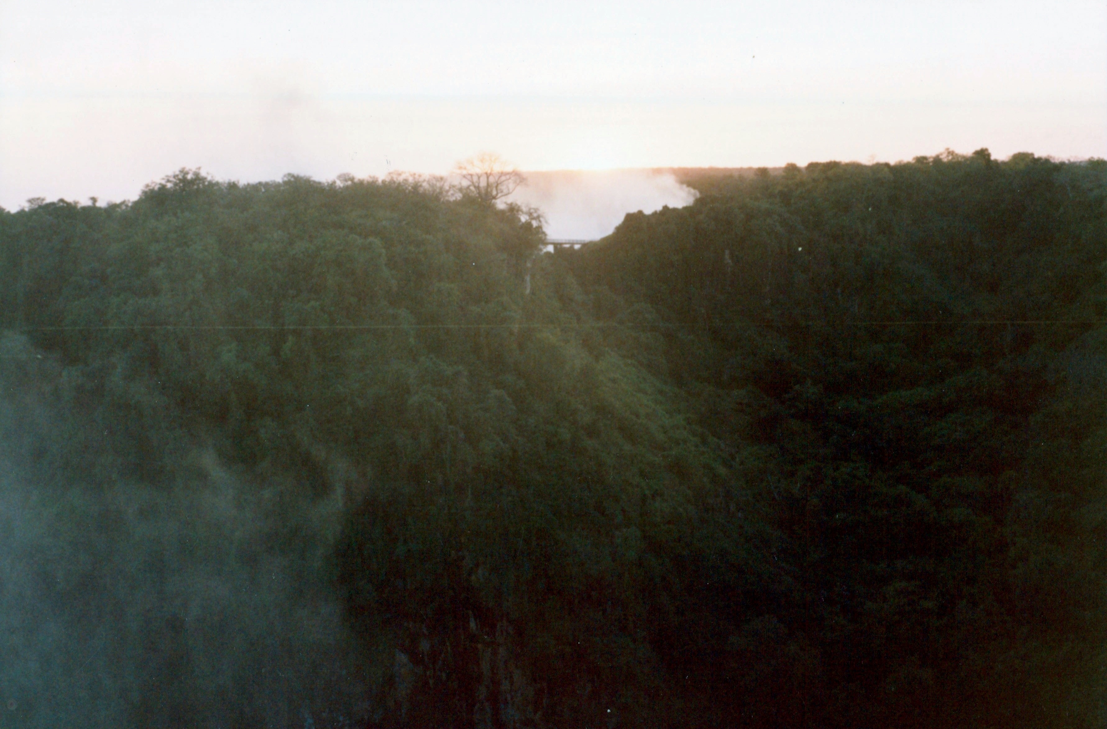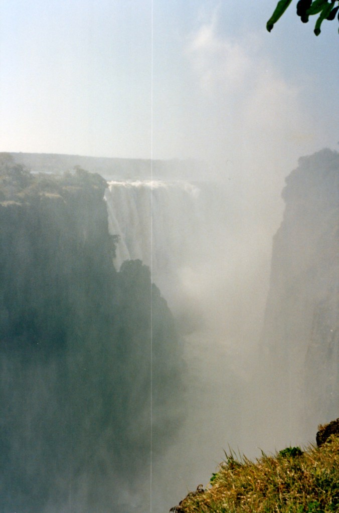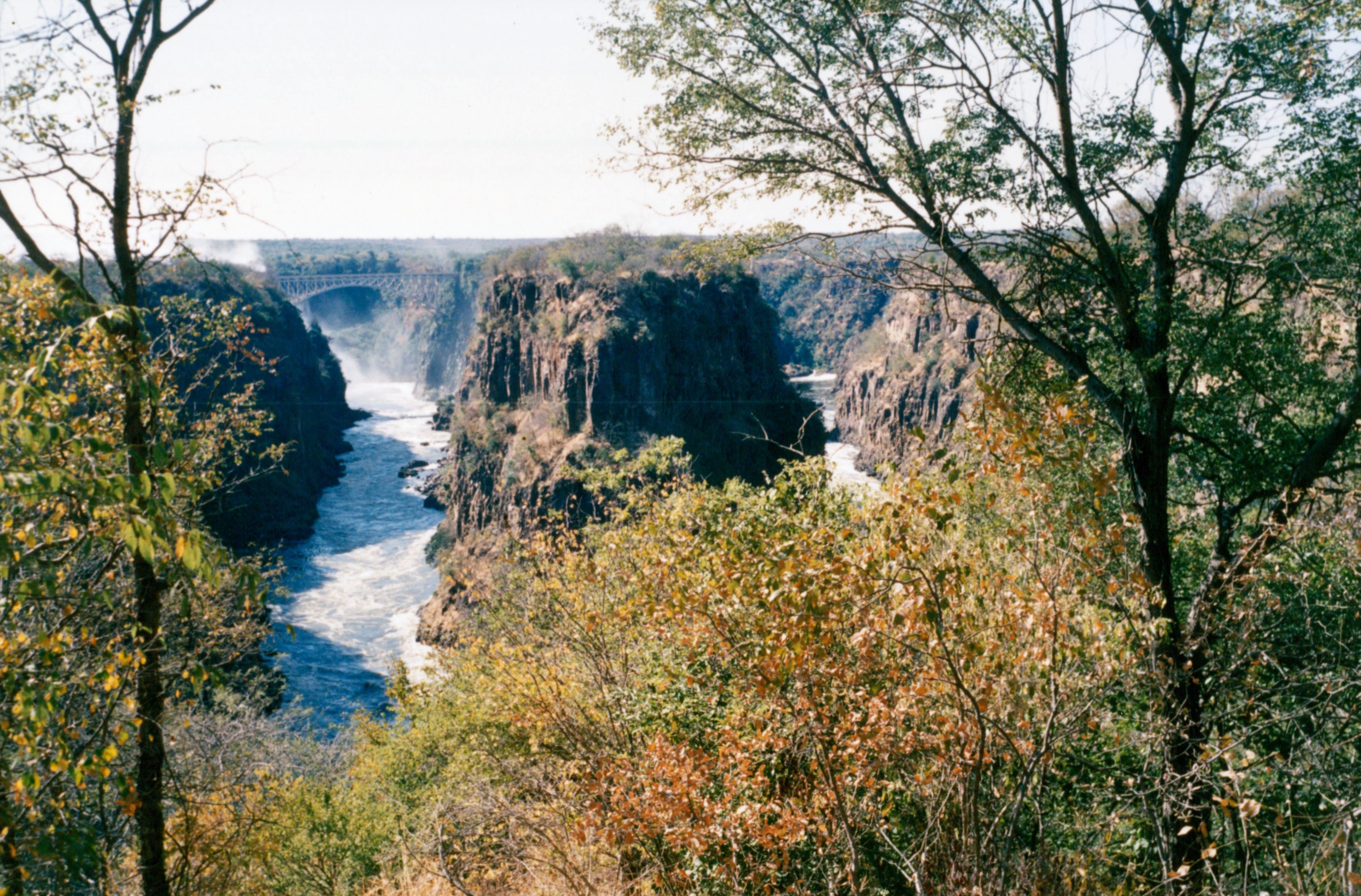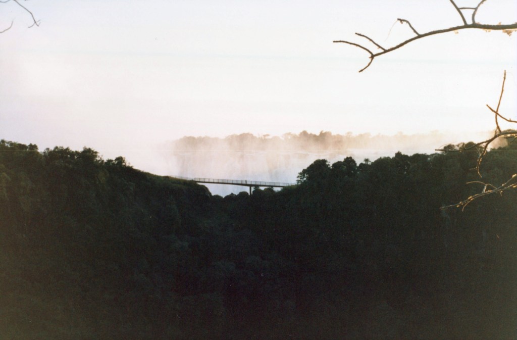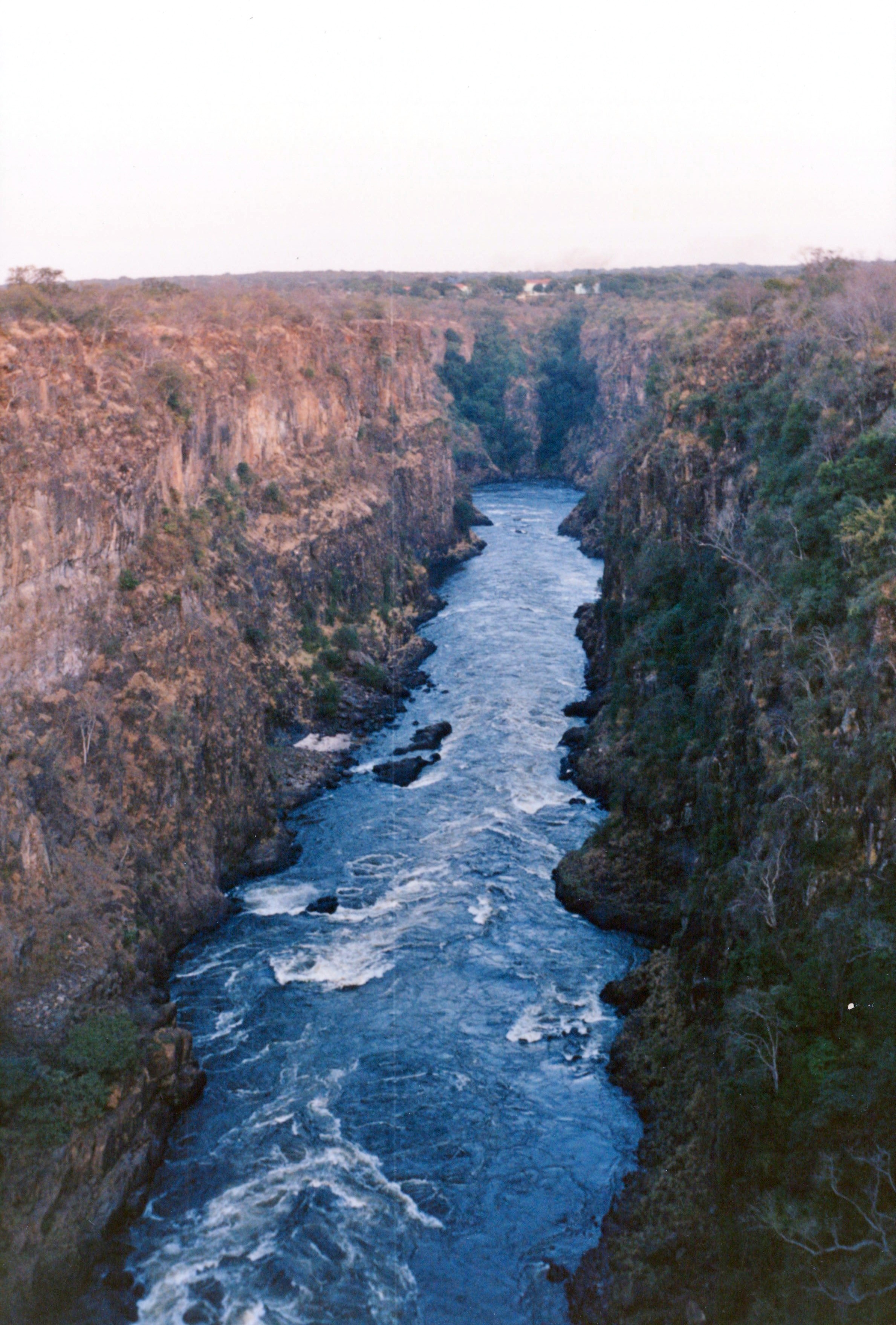 We ride off to the Victoria Falls bridge and cross what looks like a single span section of the Forth Road bridge high above the cauldron of churning water. We enter Zimbabwe, get our carnets stamped and play the insurance game. I come clean and buy some while Leigh proffers his worldwide comprehensive policy. We are not surprised when this is rejected but are delighted when told why. As it is comprehensive, it does not cover third party claims. We pay up, have a chat with the customs guy and are told that constitutes the search and head off into the town itself. There are flowers and bushes lining the streets with perfect pavements, sensible drivers, an immaculate railway station and up ahead a Wimpy bar. We check in at the thick pile grass carpeted campsite and walk around the town before pouncing on Mr Narayan’s takeaway and removing most of his samosas. Back at the campsite we meet a Canadian couple — Andy and Jenny – and agree to meet them for a drink in the Victoria Falls Hotel after supper.