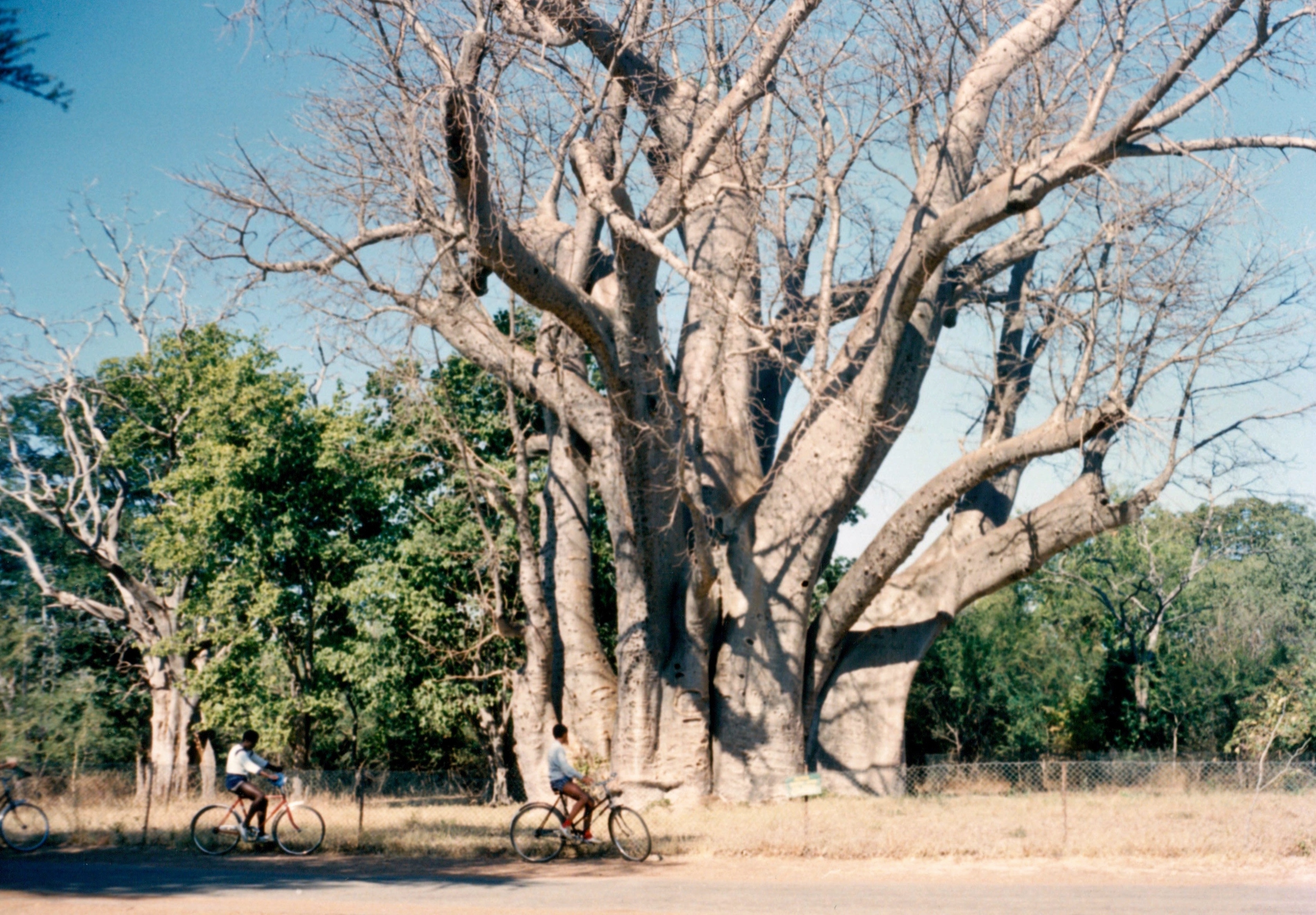 The route south passes through a modern city centre of large concrete buildings with an Aeroflot office prominent. We linger over our breakfast for a couple of hours taking in what seems to us by now vast quantities of egg, bacon, sausage and toast but which is probably only as much as an ordinary English breakfast. We turn our bikes south once more and head off for the 270-mile stretch to Livingstone and the mighty Zambezi River. There are a number of roadblocks at which we have our passports inspected upside down but the day is warm and the biking wonderful. We drop off a long range of hills and stop in a market town where we buy cheese at a butchery.