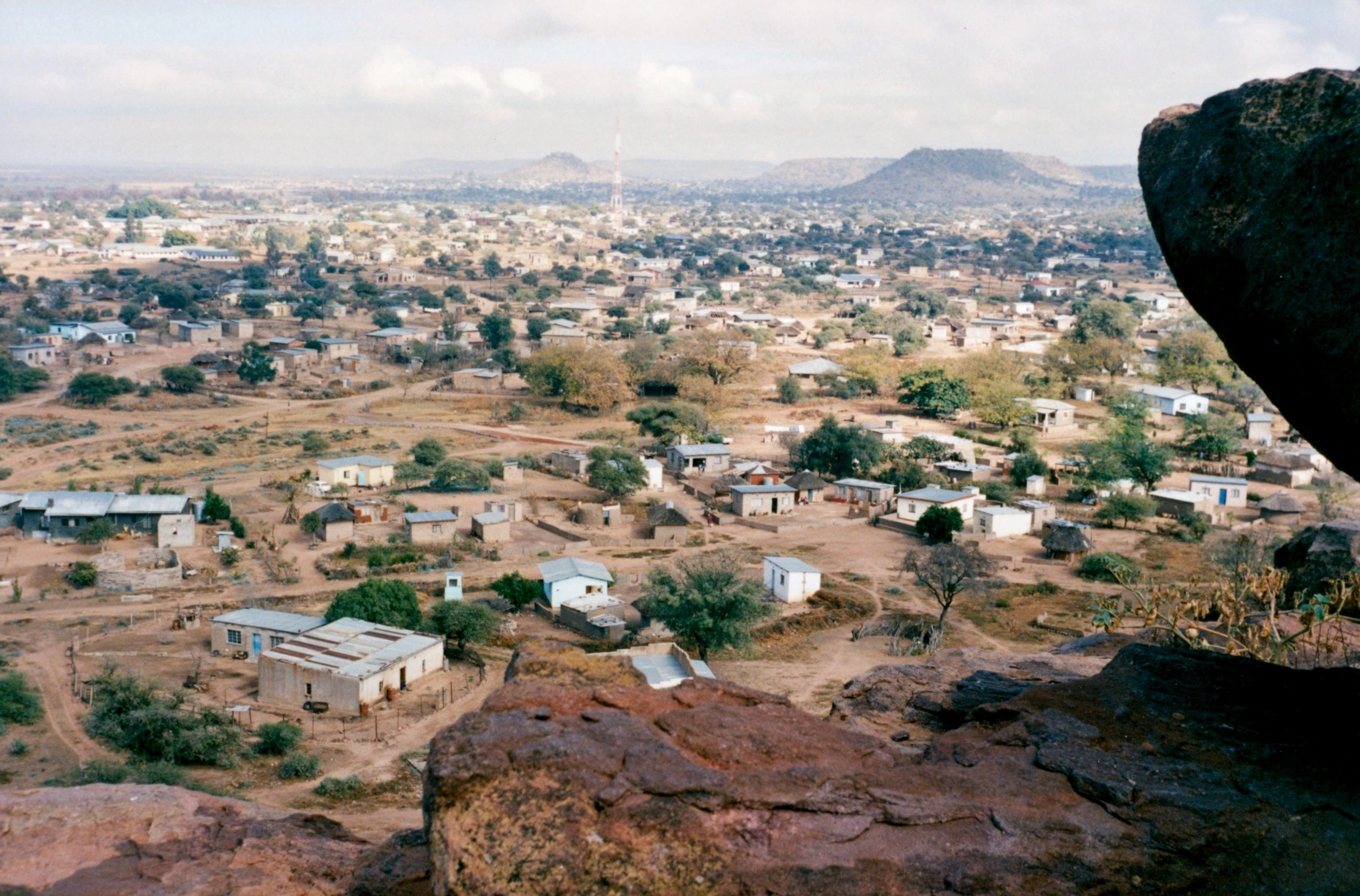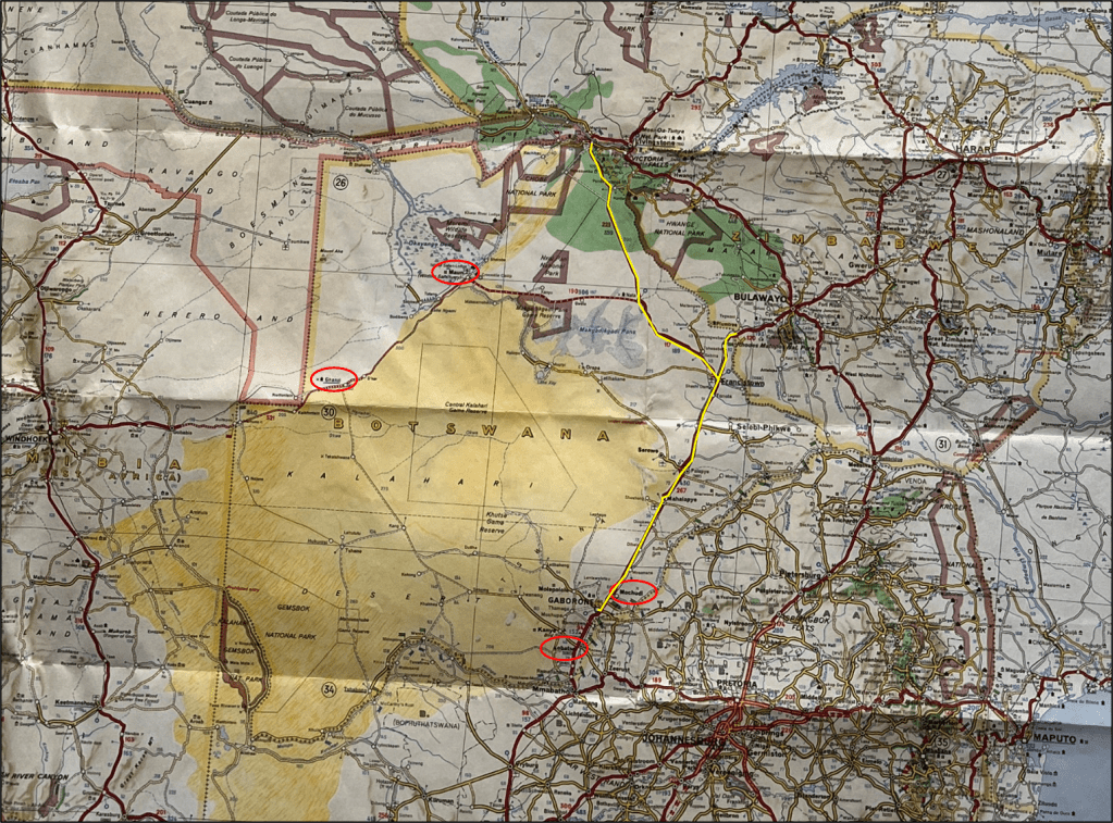 Towards the end of our stay, I am lucky to catch a plane ride out to Ghanzi, a small sun-baked town a hundred miles south – west of Maun and four hundred miles north-west of Gaborone. This is very much a frontier town in the Kalahari with Namibia next stop west. There are four stores in town, a brightly fronted Barclays Bank and the Kalahari Arms Hotel. It is very hot here by day even in winter and wandering around the empty town I meet two Italians trying to hitch out west. Here you book your lifts. They’re due to meet a guy from the hardware store later that afternoon to fix a lift with a truck leaving the next morning before dawn. Lots of the women in Ghanzi are Herero and wear the bright caps and billowing dresses introduced by the missionaries of the Dutch Reform Church at the turn of the 20th century. We fly back to Gaborone over the Kalahari and the Khutse Game Reserve. There are cattle ranches dotted throughout the desert and numerous tracks lead to water holes surrounded by the rondavels of tiny villages. The rest that we have had from travelling is much needed and we set off eager to get back biking again. At the beginning of July, we are ready to go and head back to Francistown for the last time.